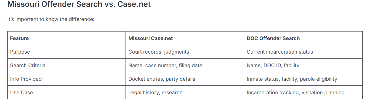 The Missouri MODOC Offender Search page on CaseNetMO.net explains how to use the official Missouri Department of Corrections (MODOC) inmate lookup system to find accurate information about incarcerated individuals, probationers, and parolees across the state.